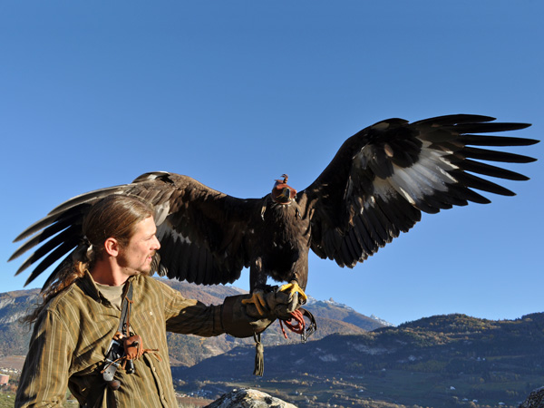 Démonstration de fauconnerie sur la colline de Valère à Sion avec Benoît Delbeauve, fauconnier, Sédun, faucon pèlerin, et Kanghaï, aigle royal. Photo ID 10038295.
