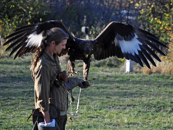 Démonstration de fauconnerie sur la colline de Valère à Sion avec Benoît Delbeauve, fauconnier, Sédun, faucon pèlerin, et Kanghaï, aigle royal. Photo ID 10038304.