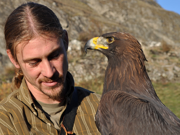 Démonstration de fauconnerie sur la colline de Valère à Sion avec Benoît Delbeauve, fauconnier, Sédun, faucon pèlerin, et Kanghaï, aigle royal. Photo ID 10038331.