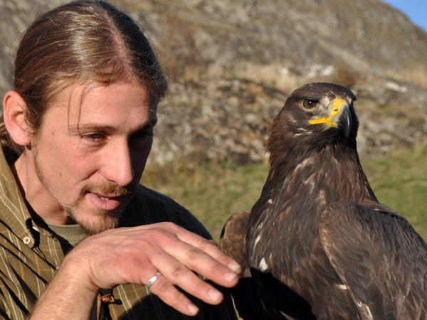 Démonstration de fauconnerie sur la colline de Valère à Sion avec Benoît Delbeauve, fauconnier, Sédun, faucon pèlerin, et Kanghaï, aigle royal. Photo ID 10038336.