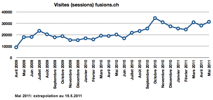 | Avril-juin 2010 | Le travail de référencement continue de porter ses fruits et, durant le 2e trimestre 2010, fusions.ch reçoit plus de 56 000 visites, contre 45 000 durant la période équivalente de 2009, soit une augmentation d'impact de près de 25%. |